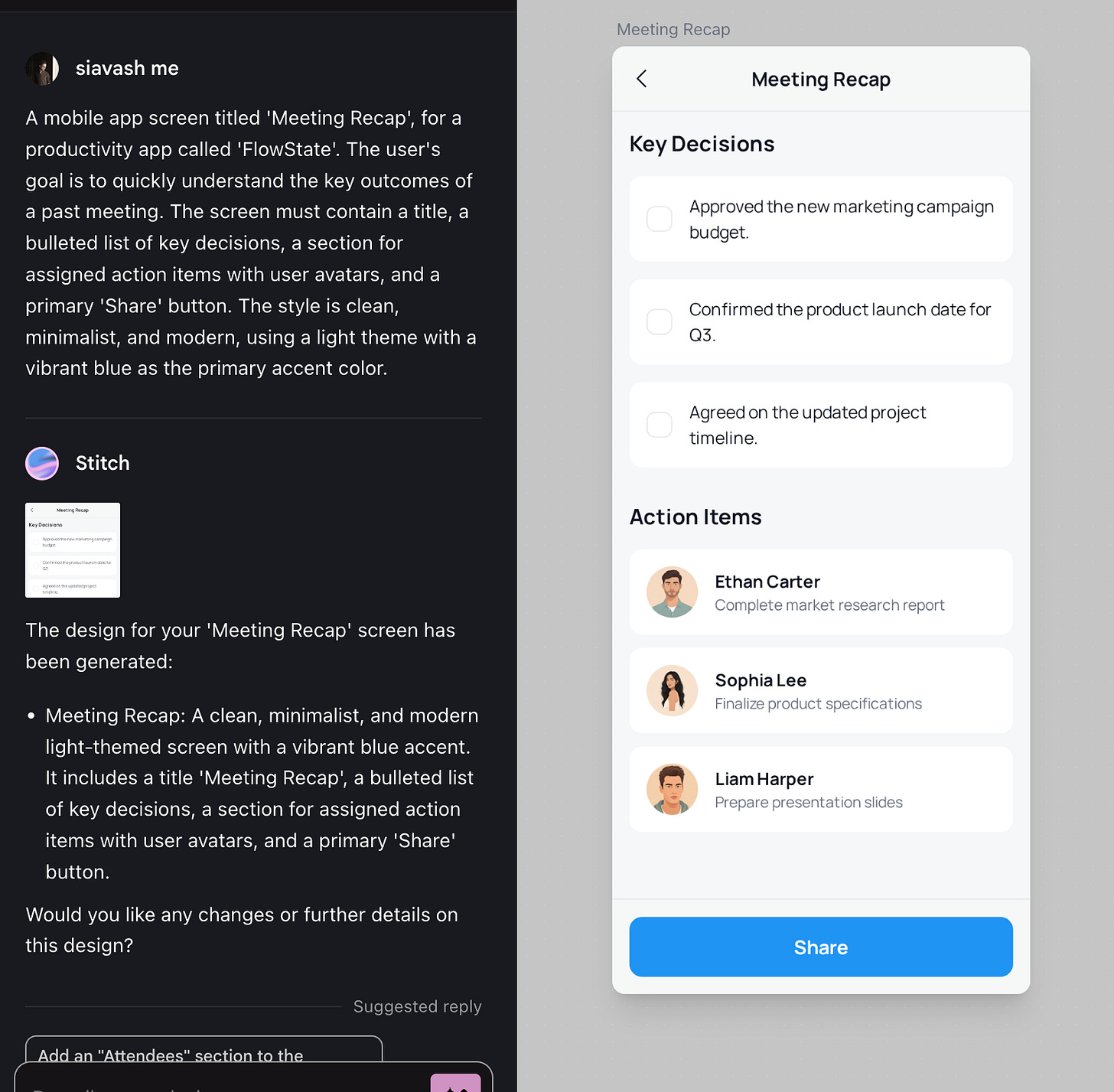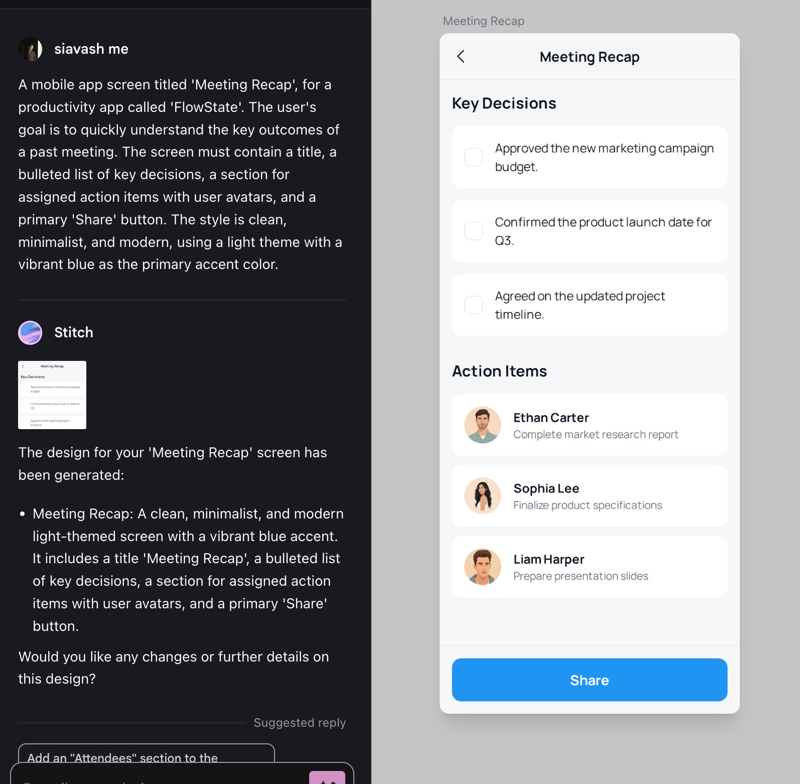 After running our prompt, Stitch generates a few variations. Let's analyze one: The layout is clean, the key decisions are nicely formatted, and the 'Share' button is prominent. However, the "assigned action items" section is a bit vague—it's just a list of names and tasks without clear structure. This is a perfect opportunity to refine.